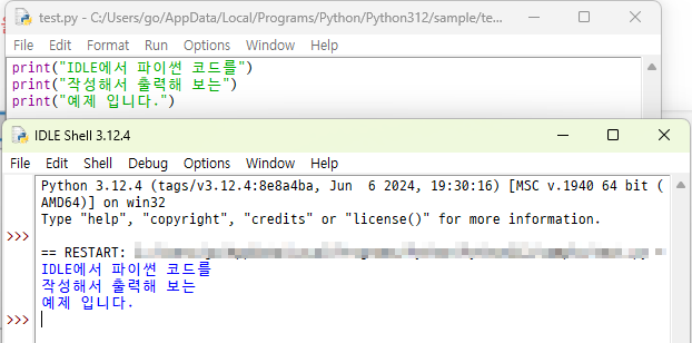 이처럼 파이썬은 텍스트 에디터인 IDLE를 사용할 수 있지만, 현업에서 많이 사용하고 다른 사람과 협업하기에는 충분치 않으므로 주로 '비주얼 스튜디오 코드'라는 프로그램을 사용합니다. 이 프로그램의 설치에 대해서는 다음 블로그에서 소개하겠습니다.