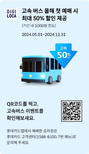 - 디지로카 모빌리티 메뉴에서 로카페이에 등록된 롯데 개인 신용카드로 고속버스를 올해 첫 이용(예매)하는 경우 최대 50% 할인받을 수 있습니다.